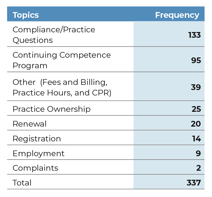 Please refer to the following table for a breakdown of the incoming calls and emails by topics and frequency for the registration year from November 1, 2023 – October 31, 2024.